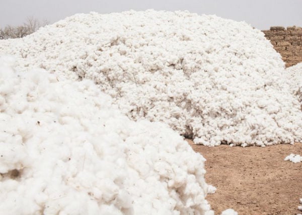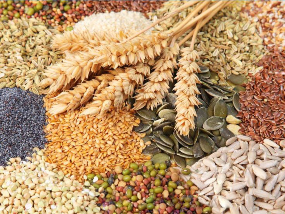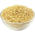 Heap of wheat grains in glass bowl isolated on white background